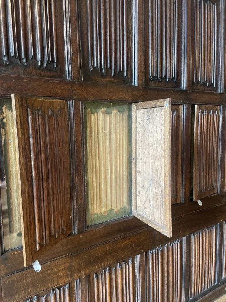 An interesting feature is that you can peer behind some of the linenfold panels (see above) to reveal a temporary but of Tudor DIY where paintings of the linenfold panels appear on the walls.